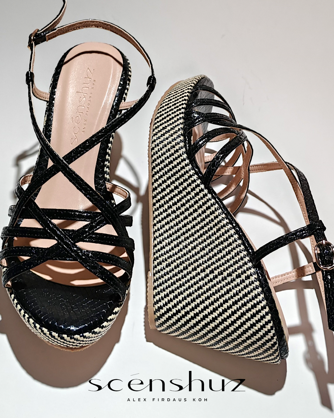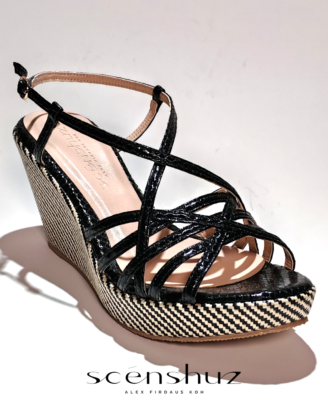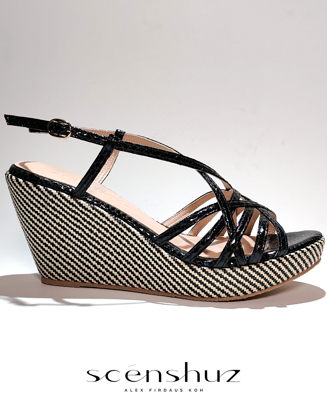 NOTA PEREKA: Ketepatan, Ceria dan Tenang. Kasut "wedge" bertali simetri ini menguasai seni reka bentuk yang bijak. Setiap tali mewakili garisan grafik yang bersih yang bergabung untuk membentuk optik ketenangan dan keharmonian, manakala "wedge" memberikan daya angkat yang nyaman sehingga setiap langkah disambut dengan keselesaan seperti awan. DESIGNER'S NOTES : Precision, Playful and Poised. This symmetrical strappy wedge masters the art of clever design. Each strap represents a clean, graphic line that comes together to form an optic of serenity and harmony, while the wedge provides a buoyant lift ensuring each step is met with cloud-like comfort. 1. Upper Material : Faux Python Metallic Print with textile backing 2. Lining & Sock : Microfibre ( Durable ) 3. Sole : Thermoplastic ( TPR ) 4. Height : 1"/Forefront, 3"/Heel, 2"/incline. BEAUTIFULLY HANDCRAFTED IN MALAYSIA.